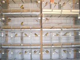 las jaulas de su interior, los canarios cantan, logicamente, al verse