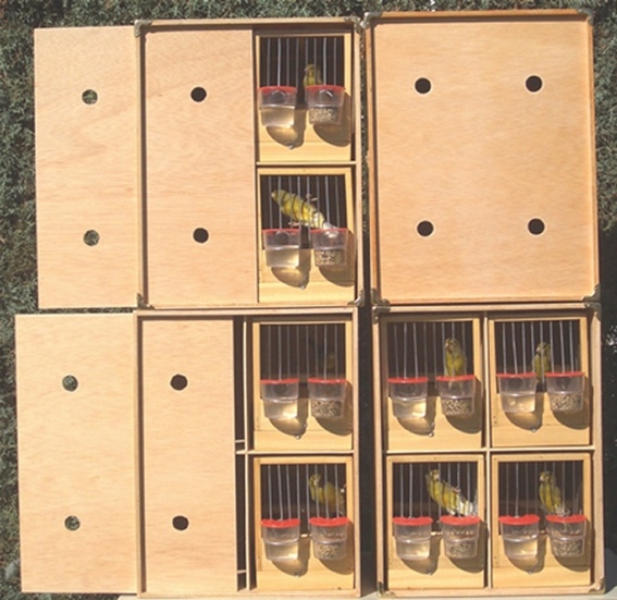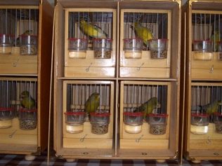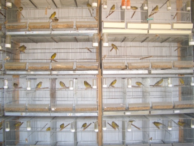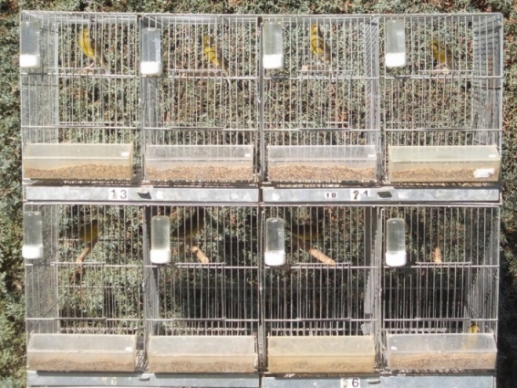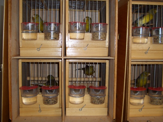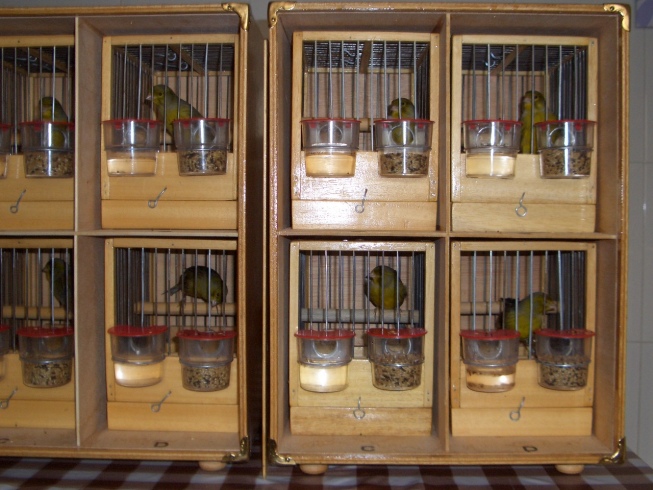 en sus jaulones de vuelo, con las rejillas de separación, convirtiéndolos