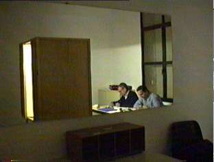 al otro lado de la cabina, en la habitación a obscuras, sin que